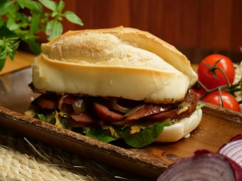 Baguete dourada crocante de 17cm, contra-filé ancho 170g suculento, coberto por mussarela derretida. Acompanhado de cebola roxa, alface fresca, tomate e rúcula.