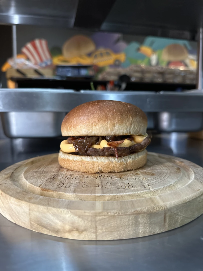 Pão smash tostado na chapa, hambúrguer 75g suculento, queijo derretido e bacon crocante. Finalizado com molho barbecue defumado.