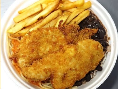 Arroz soltinho, feijão preto, filé de frango empanado e crocante, salada fresca e guarnição especial. Uma combinação perfeita de texturas e sabores para uma refeição completa e irresistível!