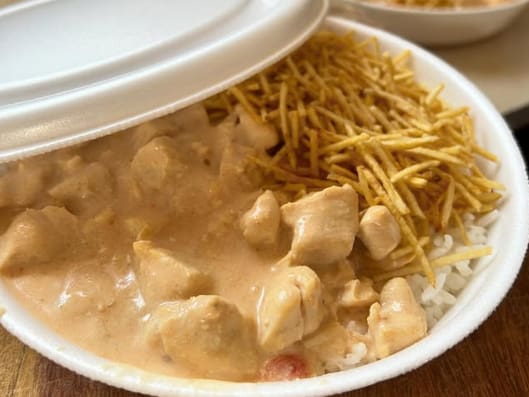 Arroz soltinho, feijão e strogonoff cremoso de frango, acompanhados de batata palha crocante e salada fresca. Uma combinação perfeita de sabores e texturas para uma refeição completa e reconfortante!