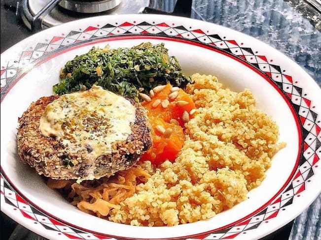 Arroz soltinho, feijão e hambúrguer vegetariano suculento, acompanhados de salada fresca e guarnição especial. Uma refeição completa, saborosa e 100% saudável.
