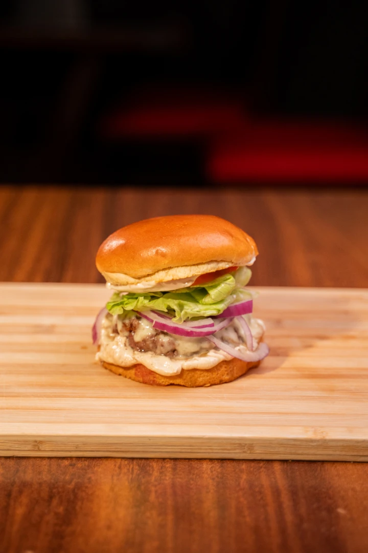 Pão tradicional, burger 140g, mussarela, alface, tomate, cebola roxa e molho grill.