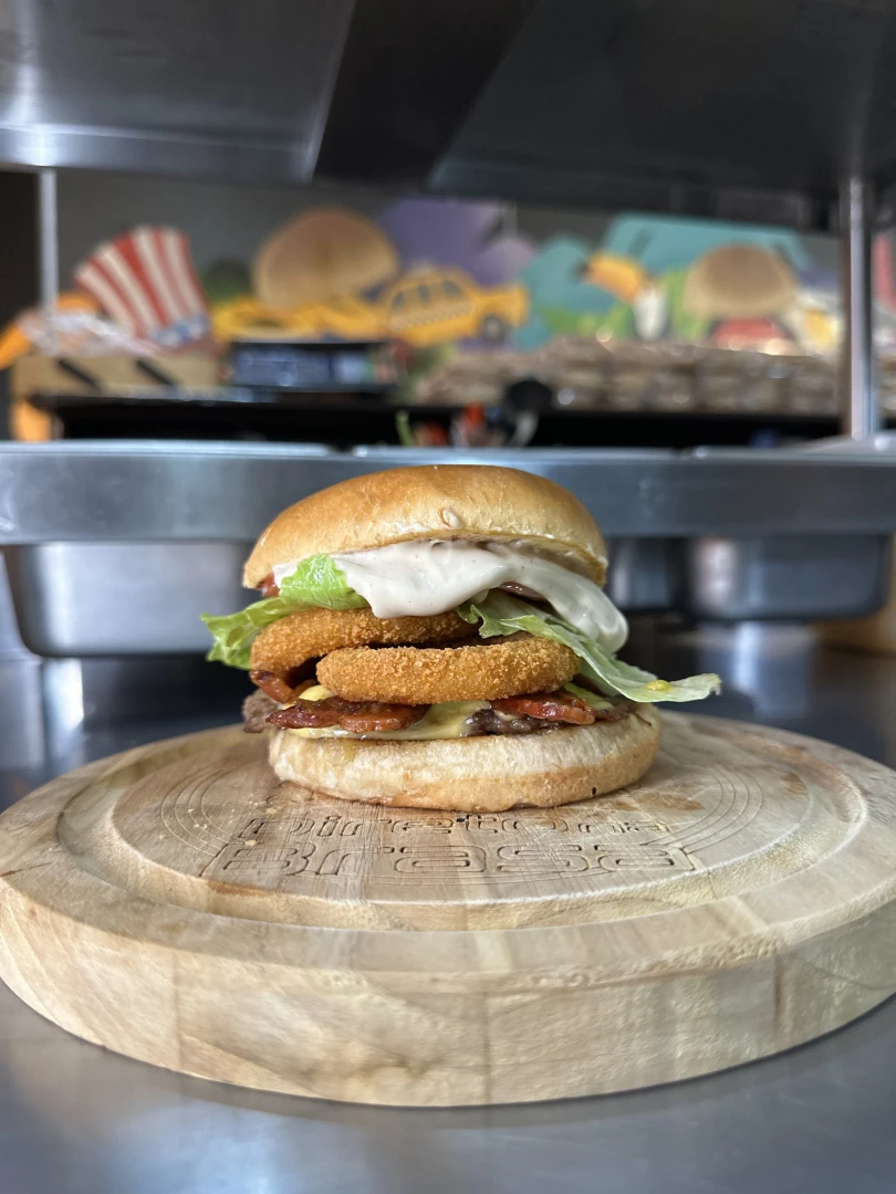 Pão tradicional levemente tostado, smash 75g no ponto perfeito, queijo derretido, bacon crocante e aros de cebola empanados douradinhos. Finalizado com alface fresca, tomate suculento e um toque especial do nosso molho grill.