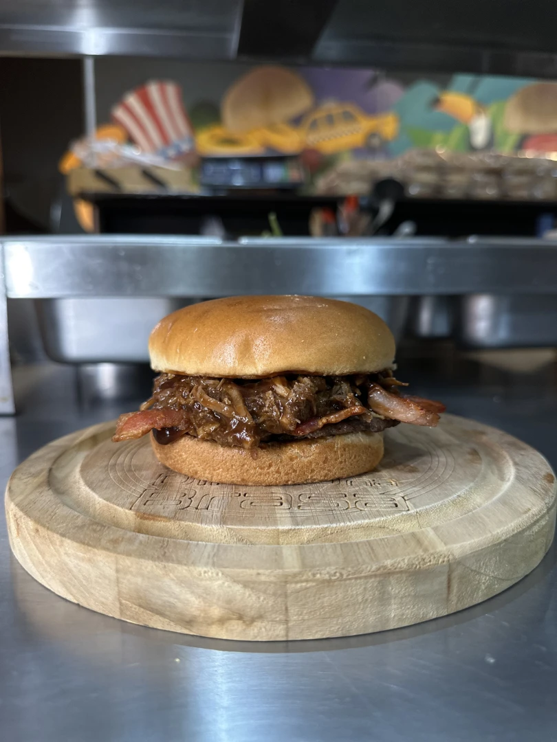 Pão tradicional levemente crocante, smash 75g suculento, queijo derretido e bacon crocante. Para elevar a experiência, carne suína desfiada ao molho barbecue.