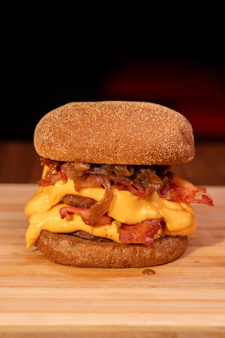 Pão australiano macio, dois hambúrgueres de 90g, duplo cheddar cremoso, duplo bacon crocante e cebola caramelizada no ponto certo.