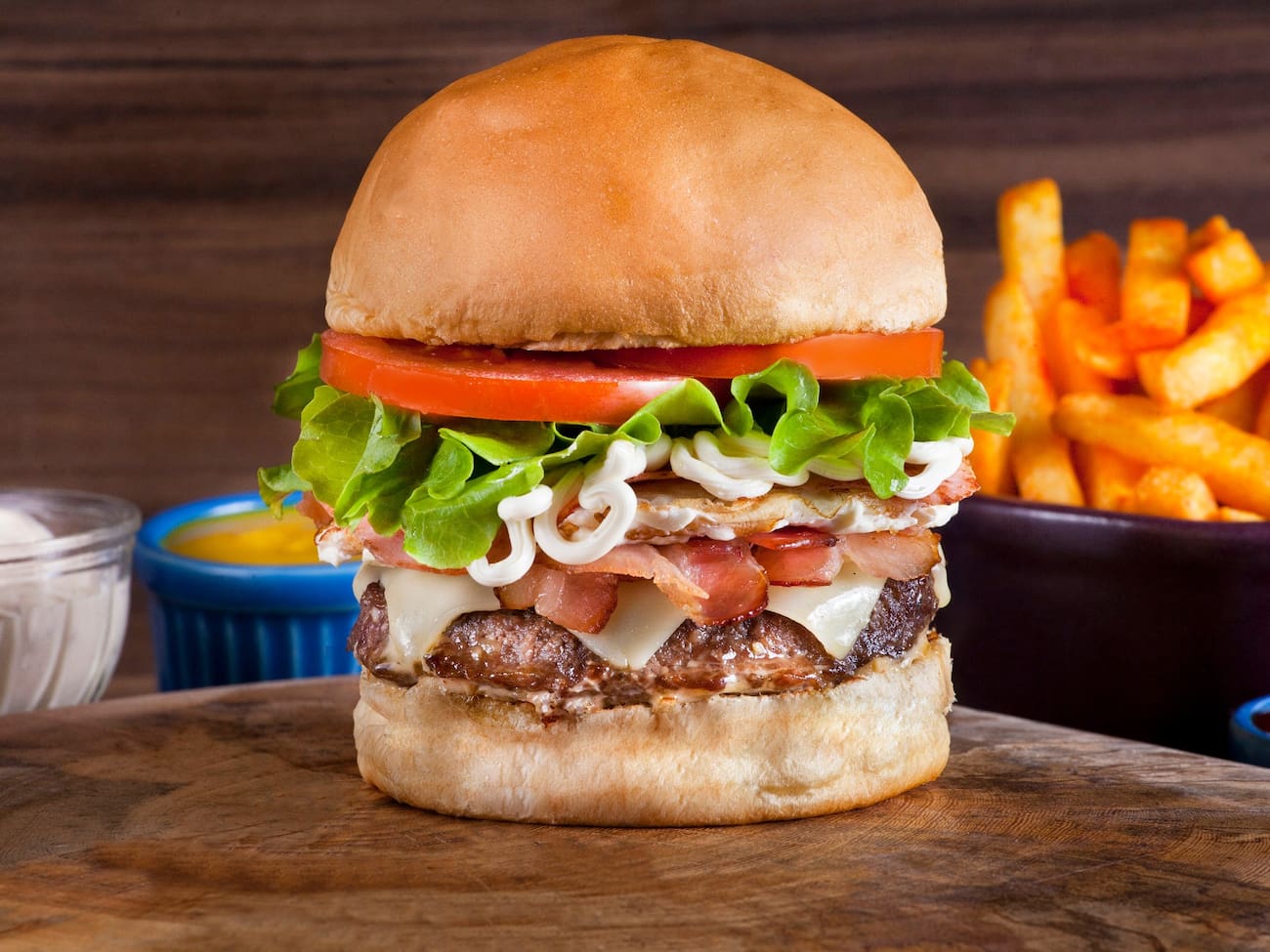 Pão tradicional, hambúrguer 160g, duplo queijo derretido, bacon crocante, presunto, cream cheese cremoso, ovo, alface fresca, tomate e molho americano.
